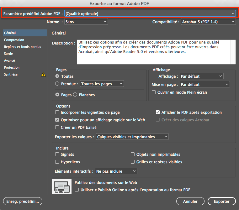 optimale]InDesign a les outils pour produire des PDF de destinés à des impressions de haute résolution. Pour cela il faut préparer le document à l’exportation par le menu Fichier on choisit Exporter. Dans le menu Style on choisit alors Qualité optimale pour une impression pour flasheuses, imageuses. La compatibilité Acrobat 5 avec un moteur 1.4 n’aplatira pas les transparences.