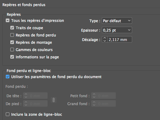 Les repères importants à cocher sont ceux de la boîte de dialogue ci-dessous. La gestion des fonds perdus se fait en fonction des paramètres du document et du périphérique extérieur.Les autres paramètres sont à laisser par défaut.Figure: Repères d'impression et fonds perdus