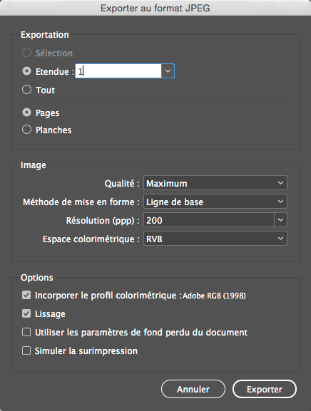 Pour récupérer une page (une couverture) en tant qu'image, il faut l'exporter dans un format compatible. On chosit la page, une qualité de compression, une résolution et un espace de couleurs (RVB).