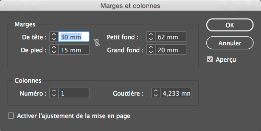 gabarit, sélectionner la ou les pages du gabarit et modifier les marges.Figure: Modification des marges et colonnes