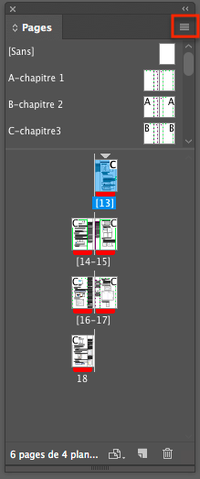 Le panneau Pages s’affiche dans le menu Fenêtre. Il est constitué d’une partie contenant