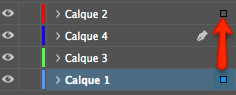 - Ordre de superposition vers un autre calque.On sélectionne un objet, puis dans le panneau on fait glisser la puce de couleur verticalement pour placer l'objet sur un autre calque.