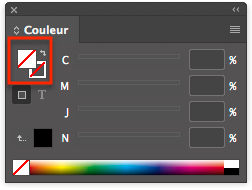 Note: Le carré barré en premier plan permet de composer temporairement des mélanges de couleurs qui opéreront sur le fond d’un objet. Si le carré évidé est devant, c'est une couleur de contour qui est attribuée.Si l’objet sélectionné contient du texte, l’option T est active. On peut attribuer une couleur au fond de texte ou à son contour sans devoir sélectionner le texte.