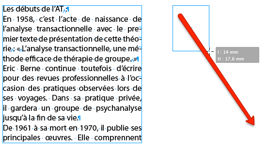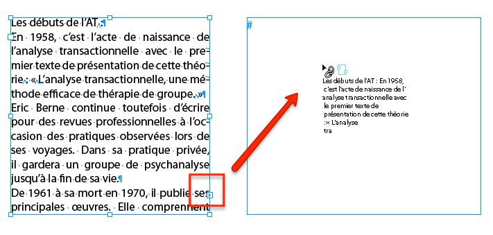- Placer la suite d’un texte en créant le bloc.Sélectionner le bloc. Faire un clic sur le signe de débordement (+) et faire un cliquer et glisser pour créet une nouvelle zone de texte qui se remplira du texte restant.