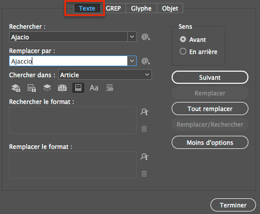 La fonction de Rechercher et Remplacer accessible dans le menu Édition permet de rechercher un caractère (spécial), des mots pour les remplacer. La recherche s’effectue dans le bloc sélectionné (Article), dans le document ou dans tous les documents. Si Mot entier est coché, le mot recherché sera délimité par des espaces ou des signes de ponctuation. Le respect de la casse recherche le mot tel qu’il est saisi. Lors de la recherche, si on ne saisit aucun mot dans le champ « Remplacer », alors le remplacement reprendra le mot recherché