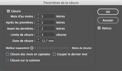 - Césures.La gestion de la césure (dans le menu local de la barre de contrôle) permet de couper les mots suivant les réglages établis. La limite de césure autorise un nombre limité de césures consécutives. La zone de césure ne s’applique que pour du texte ferré et coupera les mots à partir d’une certaine distance de l’espacement d’encart du bloc. Enfin on peut demander à InDesign d’optimiser les césures pour moins de tirets (plus de blanc) ou moins d’espace (plus de tirets. Il est préférable de décocher toutes les dernières options.