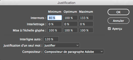 Les valeurs minimales, maximales de l’espace intermot, intercaractère, et de la mise à l’échelle glyphe ne s’applique que pour du texte justifié. Plus les valeurs minimales et maximales s’éloignent des valeurs optimales, plus InDesign a de liberté pour augmenter ou réduire l’espace pour justifier la ligne. L’intermot est l’espace généré par la barre espace entre deux mots. L’interlettrage est la distance entre les lettres. La mise à l’échelle glyphe agit sur la largeur (chasse) des caractères.
