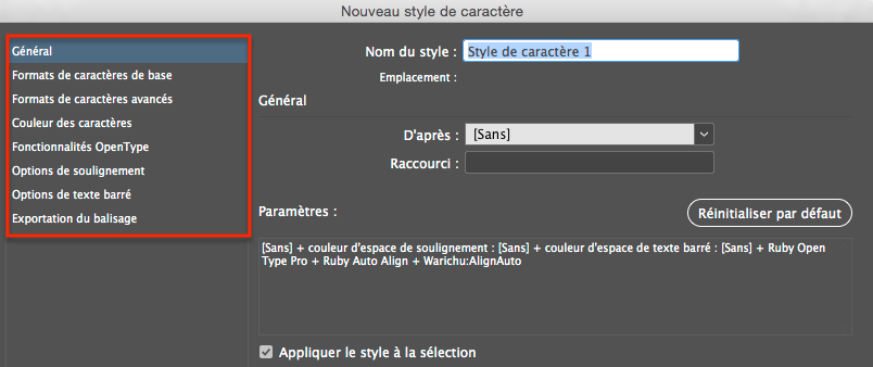 Double-clic sur le nom du style pour ouvrir la boîte de dialogue du style de caractère.